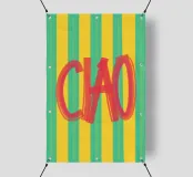 Un simpatico poster tipografico dal sapore italiano: la scritta "CIAO!" dipinta a mano in rosso vivace contrasta con lo sfondo a righe in giallo e turchese. Il mix di pennellate libere e colori retrò rende il disegno un perfetto richiamo visivo per cucine, corridoi o studi creativi. Un saluto allegro - forte, colorato e affascinante, mediterraneo.