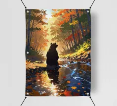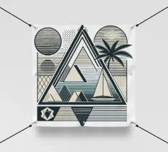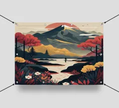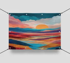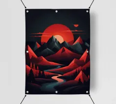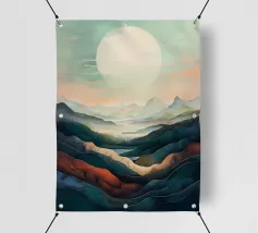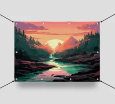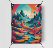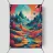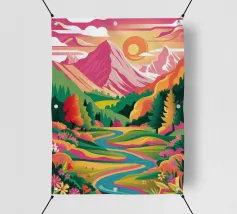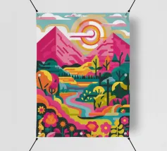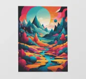 Si apre un paesaggio ipnotico, dove cime imponenti trafiggono un cielo pieno di sfere di luce. La scena è un tripudio di colori, con sfumature di arancio, rosa, blu e viola che si fondono senza soluzione di continuità. L'uso di linee spigolose e taglienti accostate a forme morbide e arrotondate crea una tensione visiva accattivante. Un fiume tranquillo si snoda nella valle, riflettendo i colori vibranti che la sovrastano. Quest'opera invita lo spettatore a esplorare un mondo in cui colore e forma danzano in perfetta armonia.