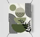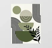 Le forme geometriche nei toni del verde terra sono completate da linee nere decise e da elementi astratti a forma di foglia. La composizione crea un'estetica equilibrata e moderna.