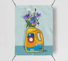 Illustrazione pop art di fiori in un vaso per bottiglie di detersivo.