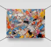 Questo dipinto astratto in acrilico cattura l'energia dinamica della tecnica dell'action painting, ispirata a Pollock. Vibranti schizzi di colore in rosso, giallo, blu e bianco creano linee fluide e motivi complessi che trasmettono movimento e profondità.