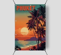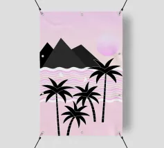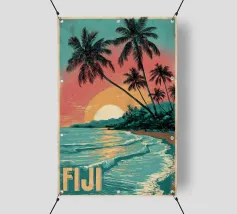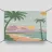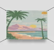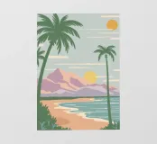 Un poster di viaggio in stile vintage raffigura una serena scena di spiaggia con palme e montagne, con il testo "Picasso", che evoca una fuga nostalgica e artistica verso la costa.