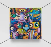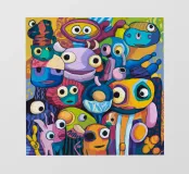 Esseri fantasiosi ed elementi fantastici si uniscono in una composizione vibrante. Questo dipinto invita gli spettatori a esplorare un mondo magico dove la creatività non conosce limiti.