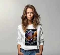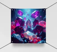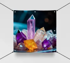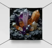 Una collezione di cristalli vibranti si trova su una base di pietra scura, che mette in evidenza le loro varie forme e colori. La luce soffusa enfatizza la bellezza e la chiarezza di ogni gemma.