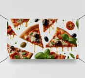Diversi tranci di pizza sono esposti ad arte con condimenti vivaci come olive, pomodori e foglie di basilico fresco, creando un'invitante visione culinaria.
