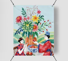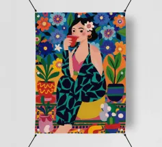 Un ritratto stilizzato di una donna con fluenti capelli scuri circondata da un'abbondanza di fiori e frutti colorati, che celebra la vita, la fertilità e la creatività.