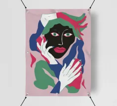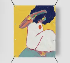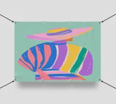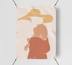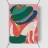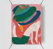Un ritratto astratto di una donna il cui volto è oscurato da un grande cappello verde e da abiti colorati, che creano un'aura di mistero e intrigo elegante.