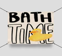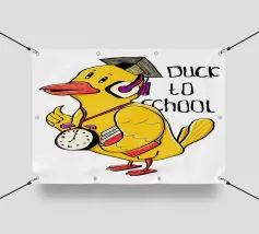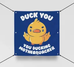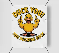 Un'esuberante anatra dei cartoni animati si erge con aria di sfida, indossando occhiali da sole e assumendo una posa da duro. Il testo in grassetto in stile graffiti recita "Don't Duck With Me", con spruzzi d'acqua e vivaci colori urbani.