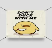 Un'esuberante anatra dei cartoni animati si erge con aria di sfida, indossando occhiali da sole e assumendo una posa da duro. Il testo in grassetto in stile graffiti recita "Don't Duck With Me", con spruzzi d'acqua e vivaci colori urbani.