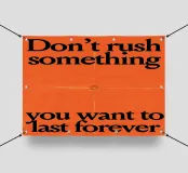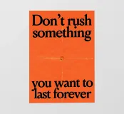 "Il messaggio motivazionale 'Non affrettare qualcosa che vuoi che duri per sempre' è presentato in grassetto, con caratteri neri su uno sfondo arancione vibrante, creando un senso di calma e intenzione. La texture della carta vintage e le sottili pieghe aggiungono un tocco di nostalgia e autenticità al design",
