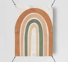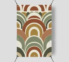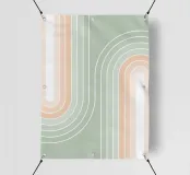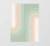 Una rilassante illustrazione grafica astratta a doppio arcobaleno, caratterizzata da linee e forme geometriche bianche in tonalità verde salvia e soffice pesca. Questo disegno sereno e minimale evoca l'inizio della primavera, la tranquillità e l'ottimismo, perfetto per aggiungere un fascino di ispirazione rétro al vostro spazio. Ideale per ravvivare una stanza tranquilla, dona armonia ad opere d'arte da parete, cuscini e accessori, offrendo un'estetica pacifica per una vita moderna.