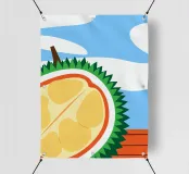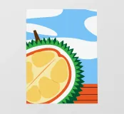 Illustrazione che mostra un frutto di durian spaccato, con un cielo blu e nuvole sullo sfondo.