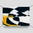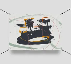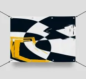 Forme astratte in nero, bianco e oro creano una composizione dinamica con curve fluide e angoli acuti. Il gioco di colori aggiunge profondità e movimento, suggerendo un senso di energia e contrasto.