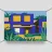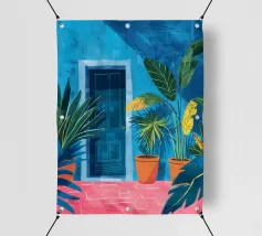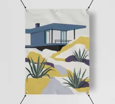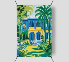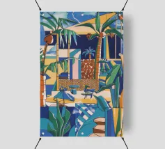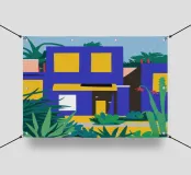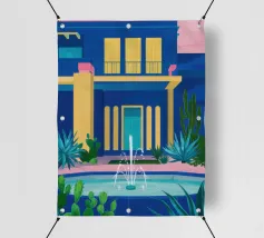 Illustrazione di un moderno edificio blu e giallo di notte, circondato da piante rigogliose. La composizione è fresca e d'atmosfera, con un'atmosfera elegante, contemporanea e urbana.