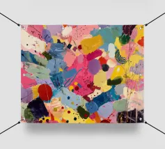 Colori vivaci si fondono in forme dinamiche, creando una composizione gioiosa ed energica. L'assortimento di tonalità offre un'esperienza visiva sorprendente e piena di movimento.