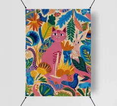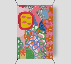 Una composizione astratta vivace e giocosa, caratterizzata da una serie di forme organiche simili a blob in blu, rosa e giallo. Le forme spontanee e i colori energici creano un senso di gioiosa espressione artistica.