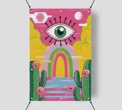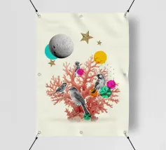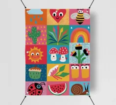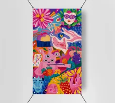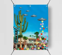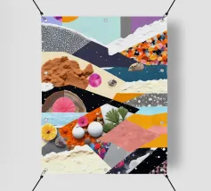 La follia colorata e il caos del collage. Ogni cosa casuale in un'immagine, con un tocco di grafica retrò. Dinosauri, alieni, polpi, funghi, pesci palla, uova fritte, montagne, lampioni, luna, biglietti del cinema, ecc.
