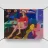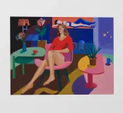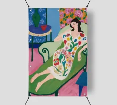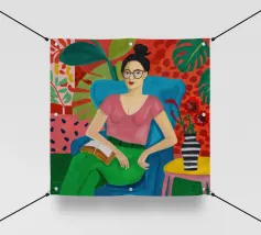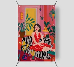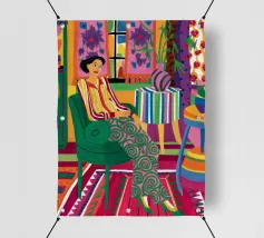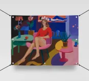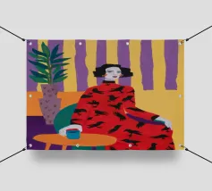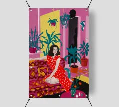 Una donna in rosso è incorniciata da forme audaci e campi di colore surreali, che fondono stile moderno ed eleganza riflessiva.