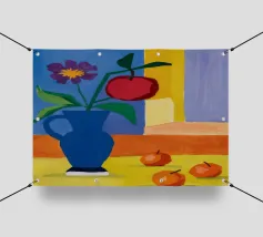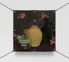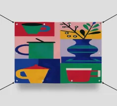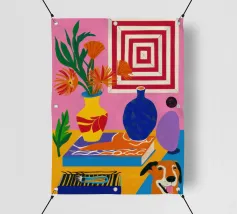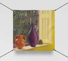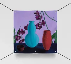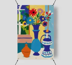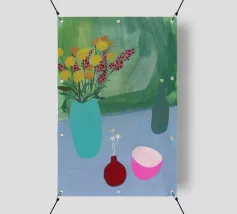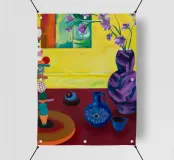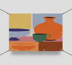 Una vivace natura morta mostra una collezione di vasi colorati (viola, blu, a righe), ciotole e oggetti decorativi disposti ad arte sul piano di un tavolo giallo brillante contro una parete segmentata rosa e verde.
