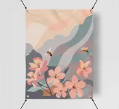 Il disegno dettagliato presenta una varietà di fiori vivaci visitati da api indaffarate.