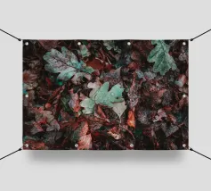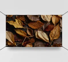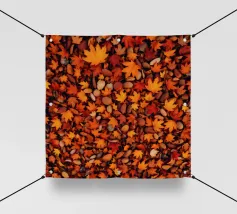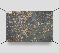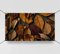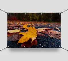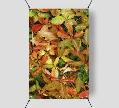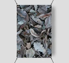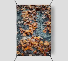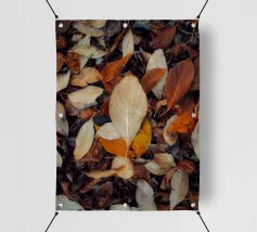 Varie tonalità di foglie autunnali ricoprono il terreno, mostrando un mix di gialli, marroni e rossi tipici del tardo autunno. Questo tranquillo spettacolo della natura evoca il cambiamento stagionale e la bellezza.