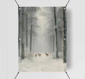 Questo suggestivo motivo invernale mostra una foresta innevata con alberi ad alto fusto, al centro della quale un piccolo gruppo di cervi si sofferma pacificamente. La leggera foschia conferisce alla scena un'atmosfera fiabesca e tranquilla che irradia calma e contemplazione. Perfetto per biglietti d'auguri natalizi, poster, calendari o come decorazione murale per la stagione invernale. Questa immagine trasmette la bellezza e la magia della natura in inverno.