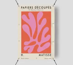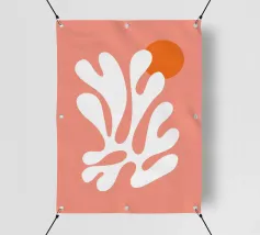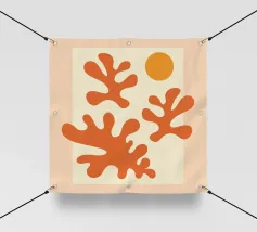 arte botanica astratta, forme moderne di piante, foglie di corallo rosa, illustrazione del sole arancione, sfondo blu pastello, design floreale minimalista, natura astratta contemporanea, grafica fogliare giocosa, opera d'arte dalle forme audaci, stampa ispirata a Matisse, atmosfera moderna tropicale, flora astratta vibrante