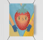 Un'affascinante illustrazione di una persona che indossa un costume da fragola con un'espressione simpatica.
