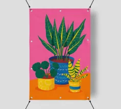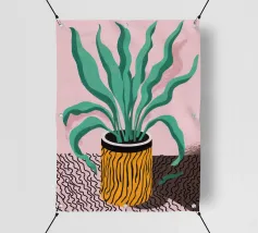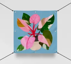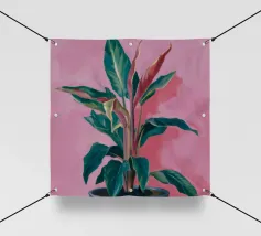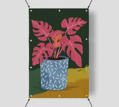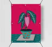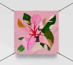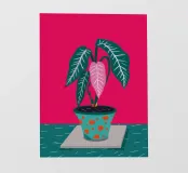 Una pianta di anthurium rosa di grande effetto si trova in un vaso variopinto e decorato su uno sfondo di un vibrante rosa caldo. La composizione è una celebrazione audace ed elegante del colore e delle piante tropicali.
