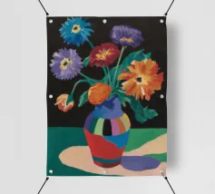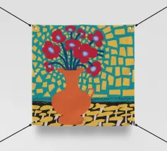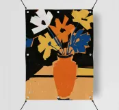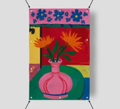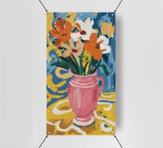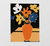 Un'opera d'arte astratta vibrante ed espressiva con una fusione di colori audaci di ispirazione fauvista come il magenta, l'arancione e il nero. Le pennellate e le forme energiche creano un'opera dinamica e appassionata.