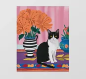 Un gatto bianco e nero siede regalmente dietro un grande vaso di fiori con motivi a strisce vivaci, sullo sfondo di una tenda rosa, creando una natura morta suggestiva e affascinante.
