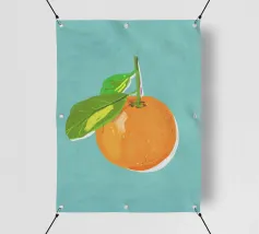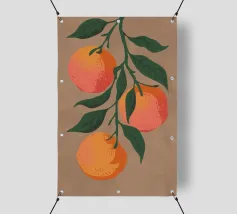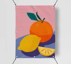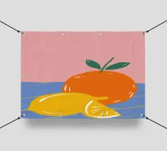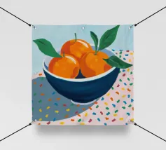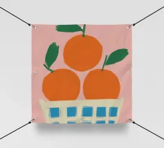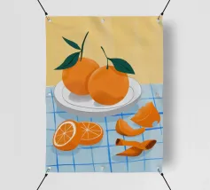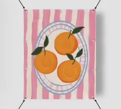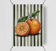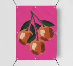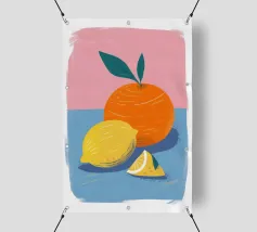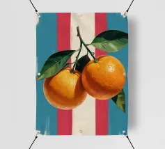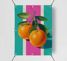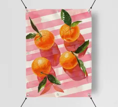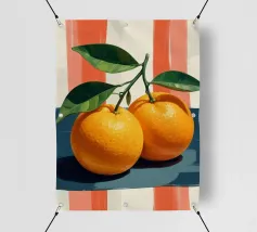 Due mandarini perfettamente rappresentati e strutturati con foglie verdi fresche si appoggiano su uno sfondo di piastrelle rosa tenue, creando una natura morta semplice, bella e moderna.