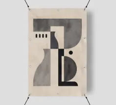Forme e linee geometriche in nero e arancione creano un armonioso disegno astratto. L'equilibrio di semicerchi, cerchi e linee crea una composizione dinamica ma minimalista. Lo sfondo neutro esalta il contrasto tra i colori e le forme più vivaci.