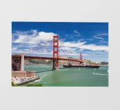 Una nave portacontainer passa sotto il Golden Gate Bridge in una luminosa giornata blu, mentre le barche a vela punteggiano il canale.