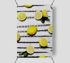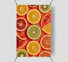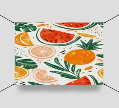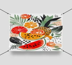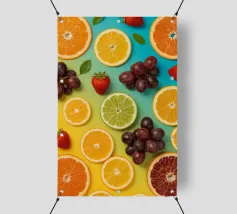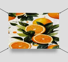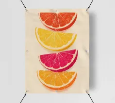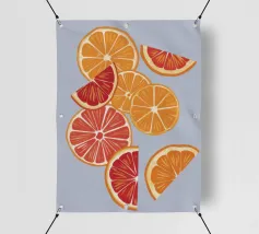 Un disegno con pompelmi e arance su uno sfondo grigio e verde.