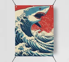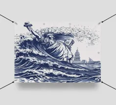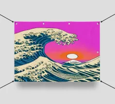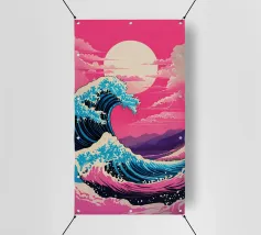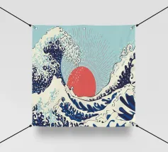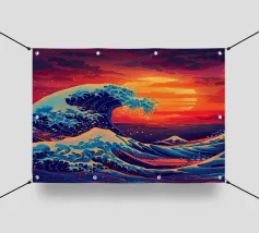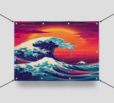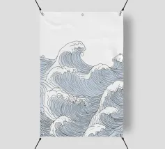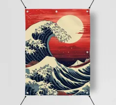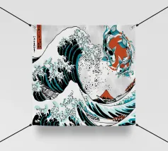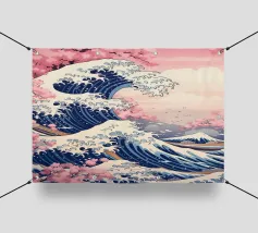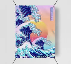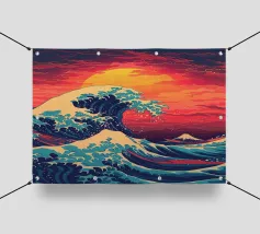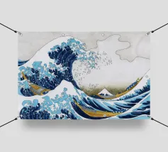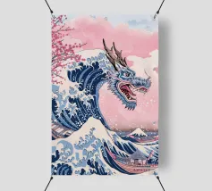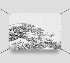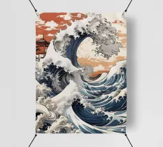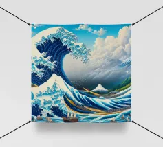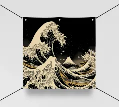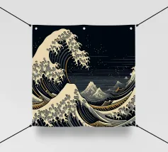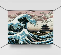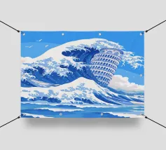 L'immagine raffigura un'illustrazione stilizzata in bianco e nero della Grande Onda al largo di Kanagawa, una famosa xilografia giapponese, con la Torre Eiffel sovrapposta all'onda. L'onda è raffigurata in un movimento dinamico e vorticoso, con creste spumeggianti e una base blu intenso. La Torre Eiffel si erge alta e slanciata, con la sua struttura intricata che contrasta con la forma organica dell'onda.