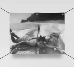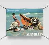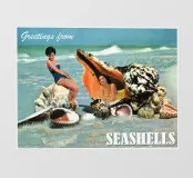 Due amici che si godono la vita delle conchiglie in riva all'oceano. Spiaggia, paradiso estivo, arte retrò. Collage originale vintage di MsGonzalez.