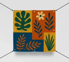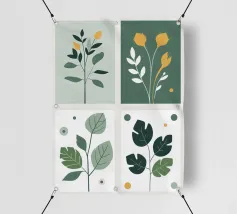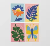 Un'affascinante griglia di quattro illustrazioni presenta un fiore, una felce, delle foglie e una farfalla, creando un bellissimo studio botanico in stile didattico.