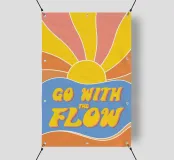 Un motivo solare in stile anni '70: un sole giallo splende in alto con raggi caldi in rosa, arancione e giallo, mentre sotto scorrono onde blu, con la scritta "GO WITH THE FLOW" in un vibrante giallo vintage. Le linee curve e la ricca palette di colori trasmettono leggerezza e una sensazione di spensieratezza estiva. Ottimismo, libertà e relax: un mantra visivo che invita a godersi il momento e ad abbandonarsi al ritmo naturale.