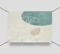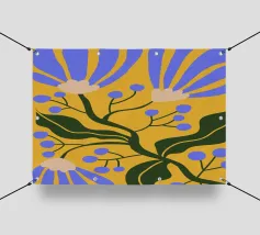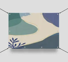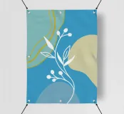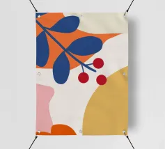 Un ramo stilizzato con foglie e bacche si staglia su uno sfondo astratto di forme blu, verdi e gialle. Le forme fluide e le morbide sfumature di colore danno un senso di armonia e di calma.