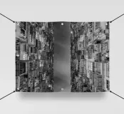 Prospettiva dall'alto di un edificio di Hong Kong. Le nuvole nel cielo sono state sfocate dalla lunga esposizione.