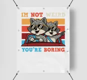 Due procioni con occhiali da sole viaggiano allegramente su un'auto rossa, con uno sfondo giocoso e colorato. La didascalia recita: "Io non sono strano, tu sei noioso".