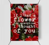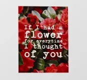 Una poesia visiva di colori ed emozioni: fiori rossi brillanti su uno sfondo verde lussureggiante fanno da sfondo alla scritta bianca "If I had a flower for everytime I thought of you" (Se avessi un fiore per ogni volta che ho pensato a te), una frase che oscilla come un pensiero silenzioso tra nostalgia e affetto. La composizione vive del contrasto tra l'intensità floreale e la chiarezza tipografica. Sembra un momento catturato, personale e universale allo stesso tempo.