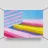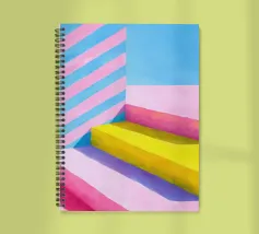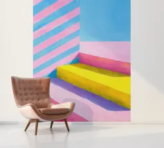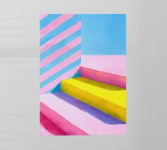Illustrazione a guazzo di gradini gialli davanti a pareti a strisce rosa-blu-gialle. Sfondo minimalista, linee decise, forme geometriche e composizione chiara. Blocchi di colore vivaci in tonalità pastello di rosa, blu, giallo e bianco creano un'illustrazione astratta, vivace ed estetica.