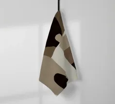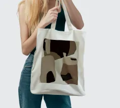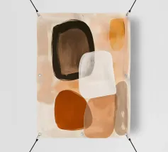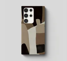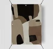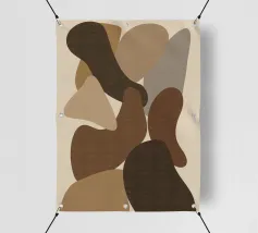 Forme astratte in varie tonalità di marrone e nero sono sovrapposte a uno sfondo color crema, creando una composizione moderna e minimalista. Le forme appaiono piatte e con bordi morbidi, suggerendo una certa fluidità e continuità nell'opera.