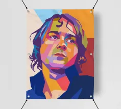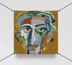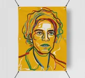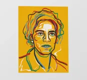 Un ritratto astratto intenso e colorato creato con linee audaci ed espressive in giallo, rosso e blu, che cattura un'emozione umana cruda ed energica con una qualità moderna, simile a uno schizzo.