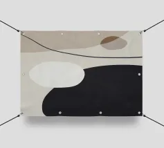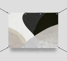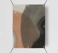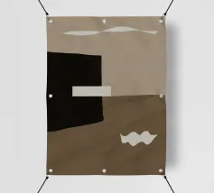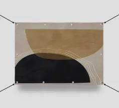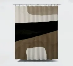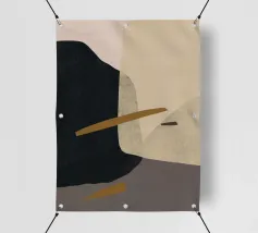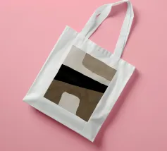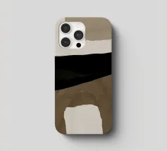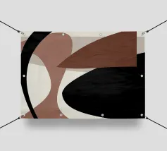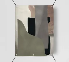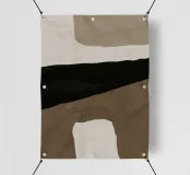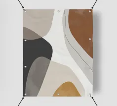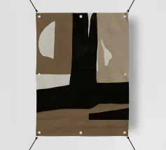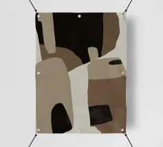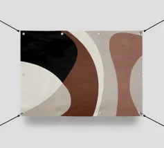Forme astratte nei toni del marrone, del nero e del bianco si sovrappongono e contrastano tra loro per creare una composizione moderna e minimalista. Il design impiega una palette di colori sofisticati e sottolinea la forma e l'equilibrio, evocando un senso di calma e semplicità.