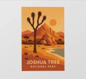 Tramonti infuocati, rocce rosse e le indimenticabili sagome degli alberi di Joshua. Questo poster riassume l'essenza cruda e mistica del deserto californiano. Uno stile forte, sia grafico che contemplativo