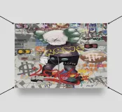 L'immagine raffigura un personaggio in stile KAWS in piedi su uno sfondo di graffiti. Il personaggio ha una testa a forma di teschio con delle "X" al posto degli occhi e indossa una maglietta scura con la scritta "KAWS" in giallo. Lo sfondo è pieno di vari elementi di graffiti, tra cui segni di dollari, corone e frammenti di testo come "LOVE", "FASHION" e "STREET ART".