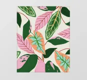 Questa vibrante opera d'arte presenta una composizione dinamica di foglie tropicali in colori audaci e contrastanti. L'opera presenta un mix di fogliame verde intenso, rosa tenue e arancione brillante, con intricati motivi di venature che aggiungono consistenza e dettagli. Il gioco di toni caldi e freddi crea un'atmosfera vivace ed energica, mentre lo sfondo pulito color crema permette alle foglie di risaltare in modo evidente. L'approccio grafico e stilizzato conferisce all'opera un'estetica moderna e giocosa, evocando la bellezza lussureggiante della natura in un design contemporaneo.